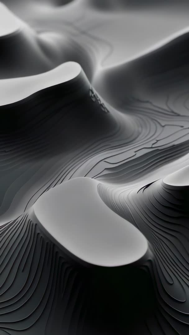 AI Generated Image. Video showing vertical camera panning over smooth layered ridges formed by abstract topographic contours. Monochrome palette emphasizing soft highlights and deep shadows, creating sculptural, tactile feel. Camera movement revealing gradual elevation changes and flowing lines that suggest topographic map or draped fabric. Minimal composition supporting wide range of uses: tech background, app intro, social vertical ads, motion graphics loop, phone wallpaper, UI hero, ambient backdrop for music visuals, architecture and design presentations. Footage working well for brand storytelling where subtle motion and modern minimalism are required. Color grading flexibility allowing introduction of color tint or gradient overlays without losing form. Deliverables ideal for 9:16 vertical format and editing into short-form content.