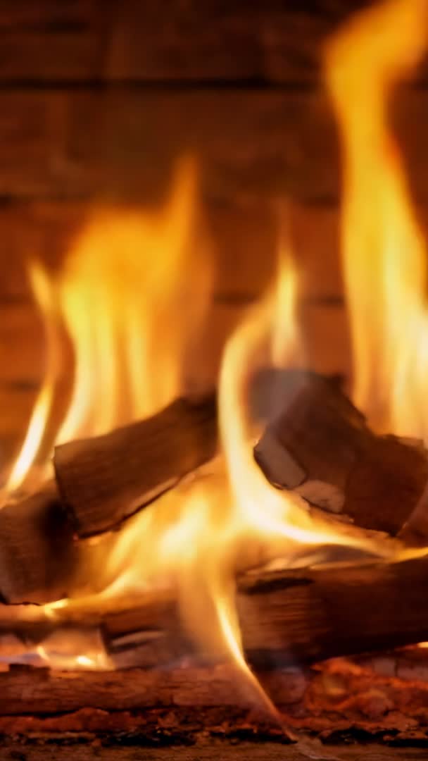 AI Generated Video. Video showing camera pulling back to reveal burning logs, dancing flames and glowing embers against brick hearth. Vertical composition capturing warm amber glow and fluid flame motion for immersive, intimate feel. Ideal for using as loopable background for social media reels, Instagram Stories, TikTok shorts, smartphone wallpapers and virtual fireplace for hospitality or retail displays. Pairing with soft crackling audio enhancing realism; trimming to loopable 10-30 second clips recommended. Leaving safe areas at top and bottom for overlay text, logos or captions. Useful for holiday marketing, winter promotions, relaxation and meditation content, seasonal newsletters and cozy home decor campaigns.