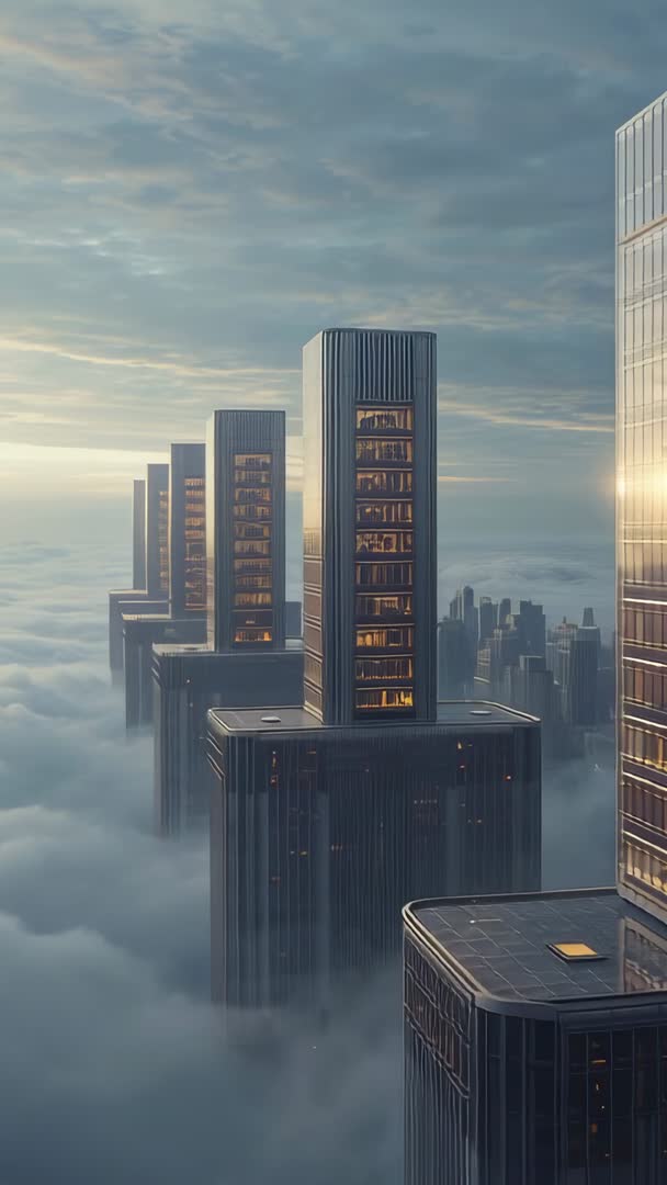 AI Generated Image. Vertical video clip showing camera pushing toward central skyscraper rising above dense fog, bringing stacked illuminated windows into sharp focus. Warm interior lights contrasting cool exterior tones, creating cinematic and moody atmosphere. Composed for tall-screen formats, matching mobile vertical ads, social media reels, and cinematic intro sequences. Serving as dramatic opener for corporate presentations, architecture portfolios, urban development promos, and science fiction trailers. Allowing easy color grading, motion graphics overlays, and title placement along sky area. Delivering high-impact visual for branding, marketing, and broadcast projects.