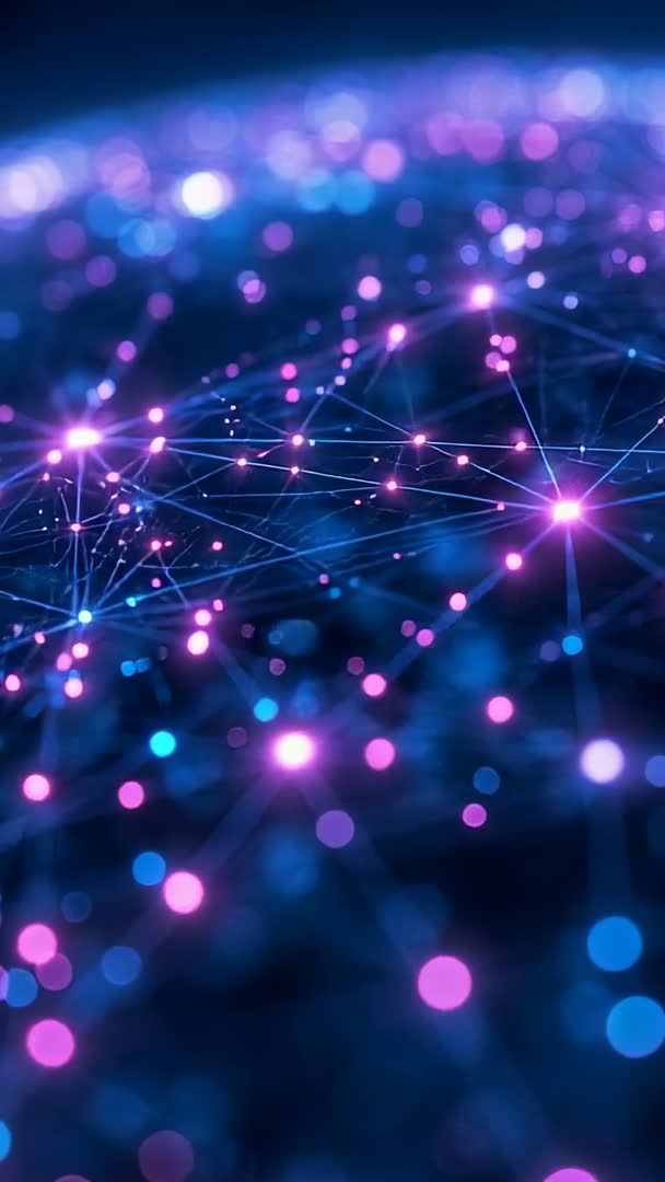 AI Generated Image. Moving camera revealing glowing nodes linked by thin lines across curved neon mesh, producing pulsing hubs and immersive bokeh highlights. Offering rich purple and blue neon palette and shallow depth of field, creating strong sense of scale and motion. Suiting tech presentations, AI demonstrations, network visualizations, cloud service promos, mobile app intros, and social vertical ads. Working as loopable background for title screens, lower thirds, and transitions, and serving as wallpaper for mobile devices. Enhancing futuristic, cyber, and data-driven narratives with cinematic glow and modern visual language.
