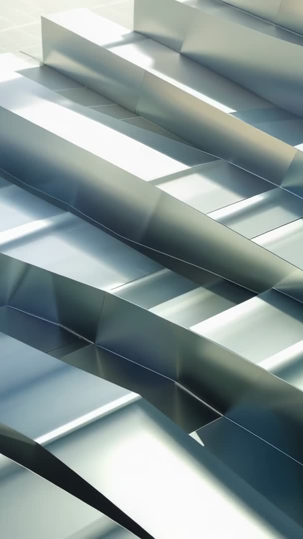 AI Generated Image. Vertical video showing camera shifting across layered metallic beams with dark-edged strips and subtle reflections. Cool metallic tones and soft highlights creating sleek futuristic mood. Slow smooth parallax motion adding depth and sense of forward movement. Loop-friendly composition enabling seamless repeat for background use. Ideal for tech promo, mobile app intro, social media story, digital signage, motion graphics overlays, broadcast lower thirds, website hero, product reveal. Color palette featuring silver and blue-gray gradient with crisp shadow accents. Easily editable for color grading, speed ramping, and text overlay placement along beam edges. Delivering modern minimalist aesthetic suitable for corporate branding, UI demo, presentation backdrop, and vertical advertising reels.