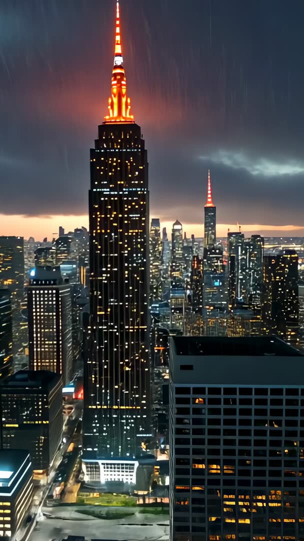 AI Generated Image. Vertical video capturing Empire State Building spire zooming in at dusk, highlighting glowing orange spire against moody clouds and sparkling city grid lights below. Camera movement delivering cinematic sense of scale and depth while illuminated windows and street lights forming geometric patterns across skyline. Featuring 9:16 vertical composition and warm dusk tones ideal for mobile-first projects and portrait-format storytelling. Serving well for travel promotion, tourism ads, skyline intros, broadcast openers, real estate marketing, urban lifestyle content, social media reels, smartphone backgrounds, architecture showreels. Pairing with ambient electronic music or dramatic orchestral score for cinematic mood. Editing tip: adding slow zoom out, parallax titles, or color grading toward teal and orange for striking visual impact.