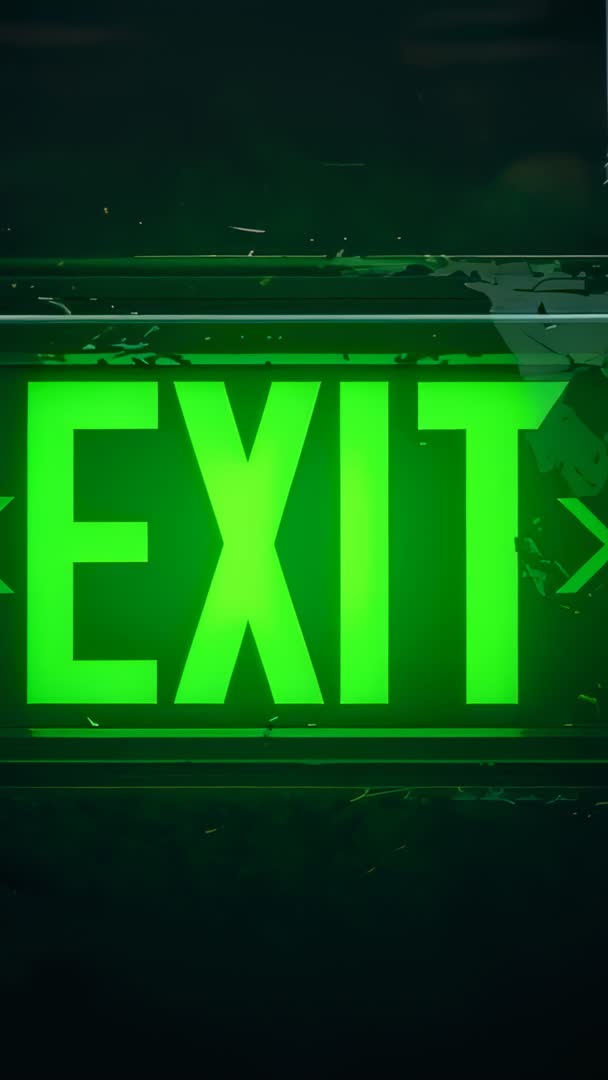 AI Generated Video. Vertical footage showing camera nudging forward and zooming into grungy green EXIT sign mounted on corridor panel. Sign glowing neon green and casting moody light while scuffs and grime are scraping across plexiglass. Close-up reveal showing directional arrow and weathered edges as background corridor is fading into darkness. Camera movement and atmospheric lighting creating suspenseful, cinematic mood with tactile, worn textures. Usage ideas: Pairing with bold typography for safety messages and emergency procedure videos; using as background for mobile splash screens and social vertical ads; cutting into thriller film openers or title sequences; featuring in marketing for signage maintenance and building safety campaigns; using as transitional clip for industrial or urban content. Suitable for color grading and motion graphic overlays.