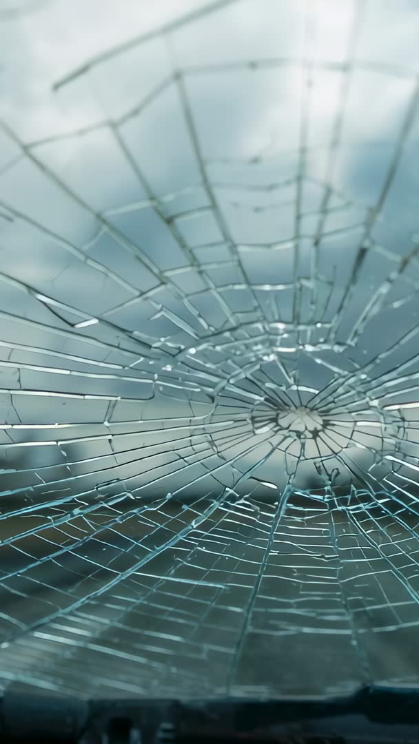 AI Generated Video. Showing vertical car footage of cracked windshield with radial fracture pattern, dashboard visible at bottom and cloudy sky blurred in background. Camera shifting upward, creating parallax between shattered glass and outside view. Shallow depth of field and close-up framing highlighting central impact point and spiderweb cracks. Providing dramatic, moody visuals for insurance and auto repair content, road safety campaigns, news reports, documentary scenes, cinematic montages, social media vertical ads, Instagram Reels and TikTok. Recommending slow motion and glass-impact sound design to increase tension. Suggesting color grading with teal desaturation and increased contrast to enhance cold, tense mood. Allowing text overlay or lower-third placement in upper negative space for headlines and call-to-action. Suitable for use as transition clip, background for article or commercial, or stylistic insert in narrative film.