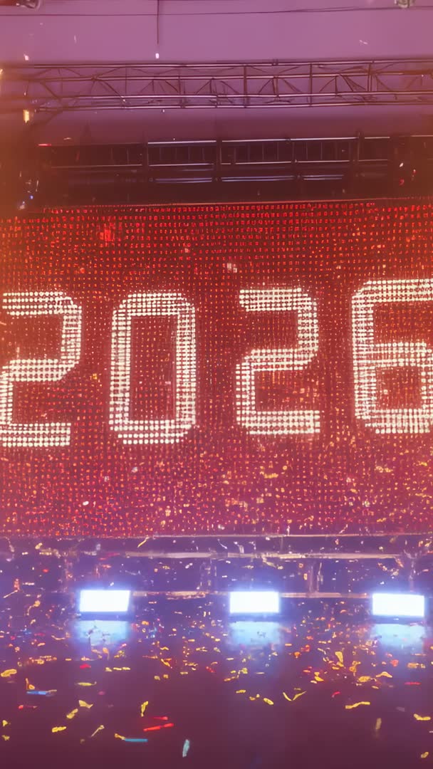 AI Generated Video. Showing bold LED digits 2026 glowing across expansive red LED backdrop, confetti falling and stage lights flashing in vertical 9:16 video. Featuring stage truss rigging, floor wash lights, and scattered confetti sparks creating dynamic foreground. Working great for New Year countdowns, product launch reveals, event promos, social vertical ads, and broadcast transitions. Use as background for title cards, countdown overlays, logo reveals, or timing sequences; combine with text animations for marketing campaigns and hero reels. Color palette dominated by warm reds and golds; slow-motion or freeze-frame edits working well to highlight confetti texture. Lighting contrast supporting high-impact intros and dramatic reveals. Recommended delivery as loopable 9:16 clip for social reels, trimmed bumpers for broadcast, and short teaser cuts for vertical ad placements.