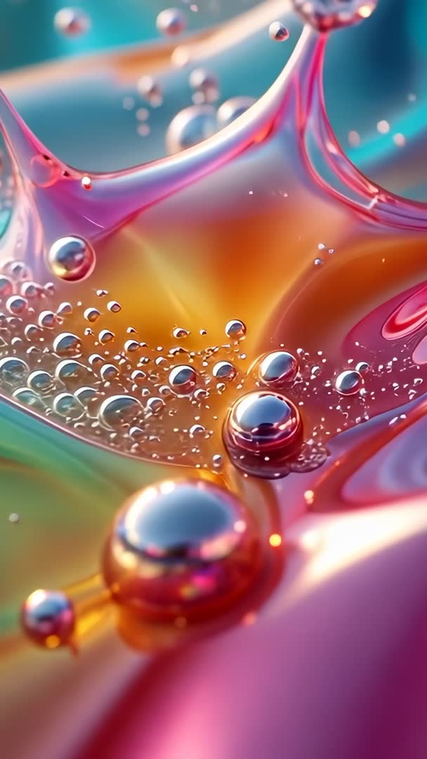 AI Generated Image. Suiting vertical platforms such as TikTok, Instagram Reels, Snapchat stories, and mobile home screens. Showcasing glossy liquid-metal surfaces, reflective droplets, and suspended microbubbles with shallow depth of field. Offering loopable short clip for seamless playback and smooth motion for slow-motion edits. Enhancing tech promos, product launches, app demos, and futuristic brand videos. Serving as ambient background for music visualizers, VJ sets, livestream overlays, and social banners. Working as eye-catching wallpaper for mobile devices or hero visual in motion graphics projects. Pairing well with electronic, ambient, or synthwave soundtracks to amplify immersive mood. Providing vibrant palette of pink, orange, teal for bold visual identity and modern creative campaigns.
