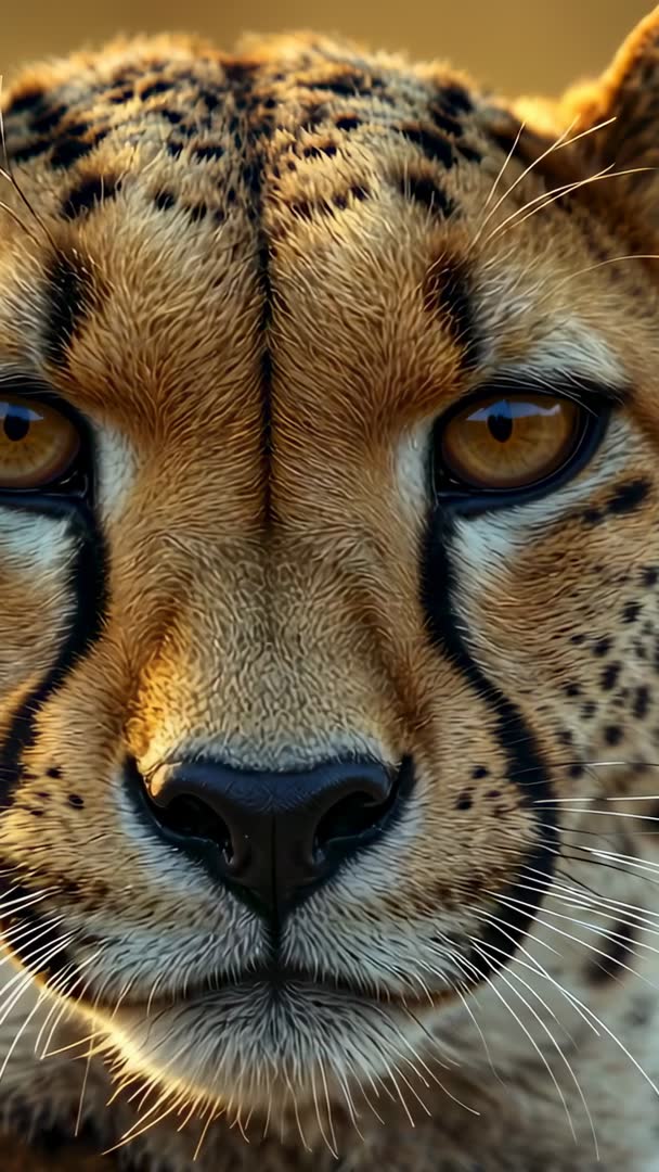- Vertical cheetah close-up video showing amber-eyed stare and twitching whiskers during golden hour