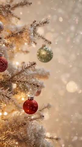AI Generated Video. Showing frosted evergreen branches gently swaying, featuring red and green baubles and warm bokeh lights. Serving as vertical video loop for Instagram Reels, TikTok, stories, and mobile wallpapers, adding cozy holiday ambience to feeds. Working as hero clip for ecommerce banners, email headers, in-store displays, and digital greeting cards, supporting seasonal promotions and product showcases. Including ample copy space on right side for overlaying text, logos, or call-to-action. Delivering soft focus and glittering snowfall for background use in holiday videos, event invites, and streaming countdowns. Providing loop-friendly motion and neutral color palette for easy branding and seasonal campaigns.