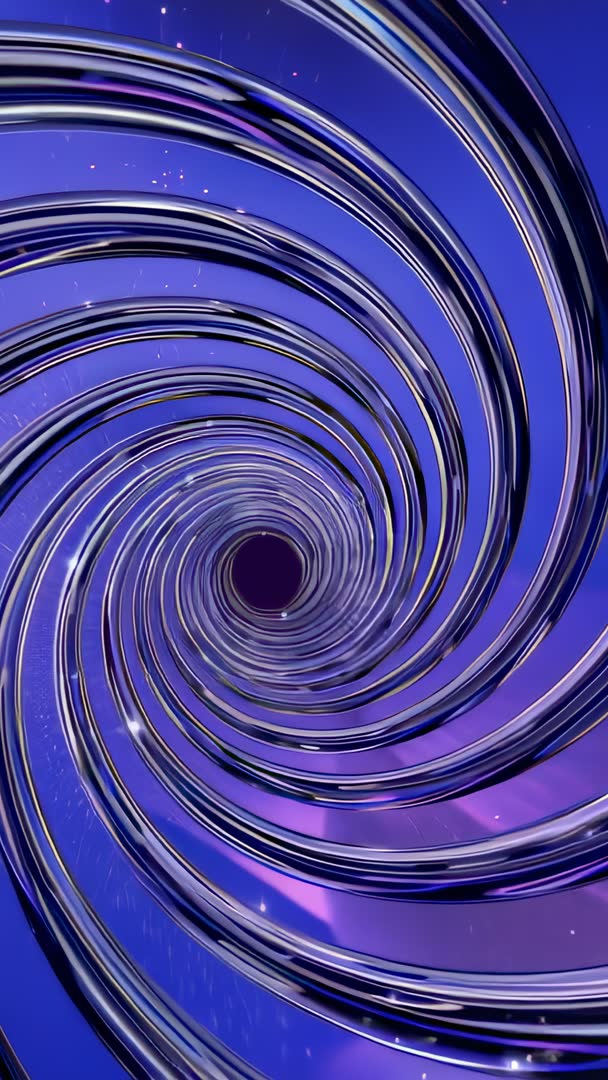 AI Generated Image. Vertical video showing chrome spiral vortex rotating inward through glossy concentric rings toward dark void. Metallic rings reflecting purple and blue light while tiny star particles drifting around spiral. Camera feeling pulled into center, creating hypnotic depth and continuous motion. Ideal for background use in music visualizers, sci-fi trailers, brand intros, app launches, social media reels, vertical ads. Seamless looping allowing smooth transitions for VJ performance and live visuals. Layering text, logos, countdowns, or product shots over mid to outer rings for dynamic title sequences and promotional content.