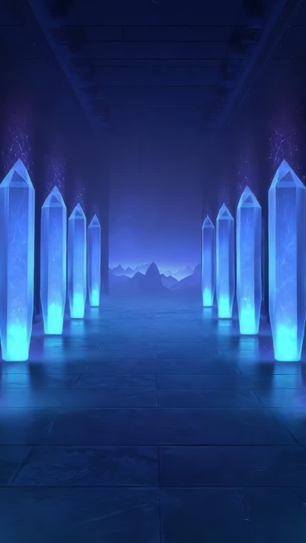 - Vertical cinematic: Advancing through glowing blue crystal pillars in mystical temple corridor