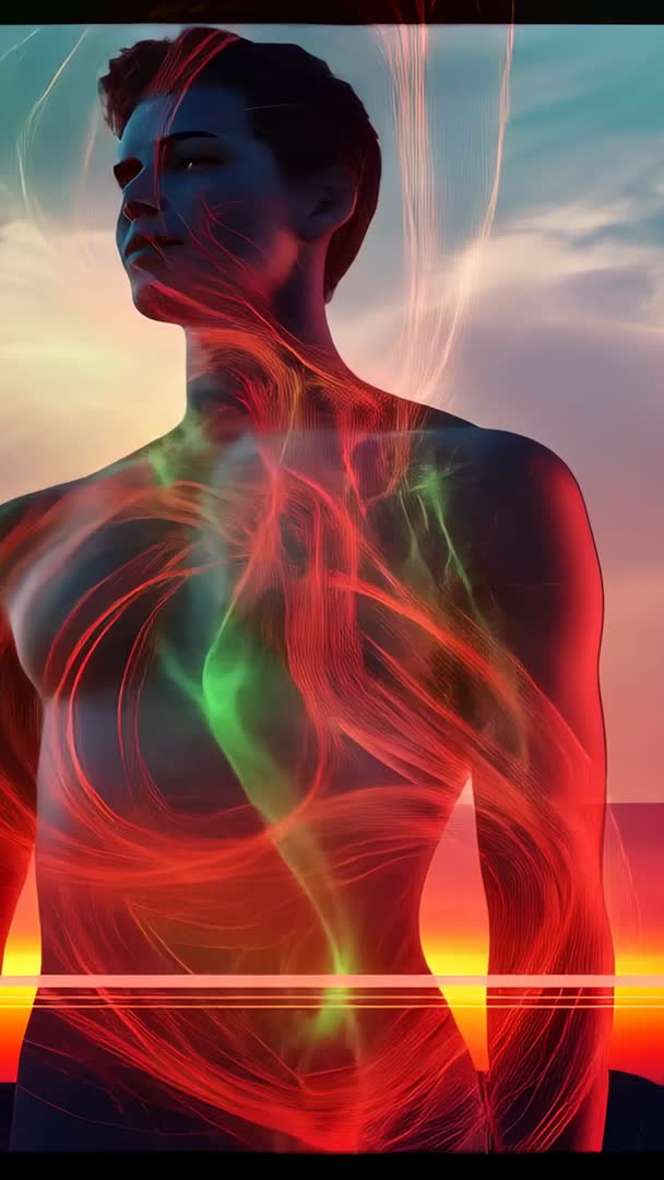AI Generated Image. Vertical cinematic clip featuring shirtless digital model against gradient sky, neon light streams moving across torso in flowing ribbons of red and green, subtle glitch lines and horizontal scan bands adding futuristic texture. Silhouette contours glowing with rim light, color palette shifting from warm sunset orange to cool teal. Motion optimized for vertical screens, loopable and attention-grabbing for short-form platforms. Serving tech product promos, fashion and beauty campaigns, music video intros, social media reels, VJ visuals, app splash screens, and brand storytelling. Suggesting pairing with ambient synth soundtrack, slow-tempo beats, and minimal typography overlays. Providing deliverables including MP4 H.264 vertical 9:16, 4K-ready and loopable timing options.