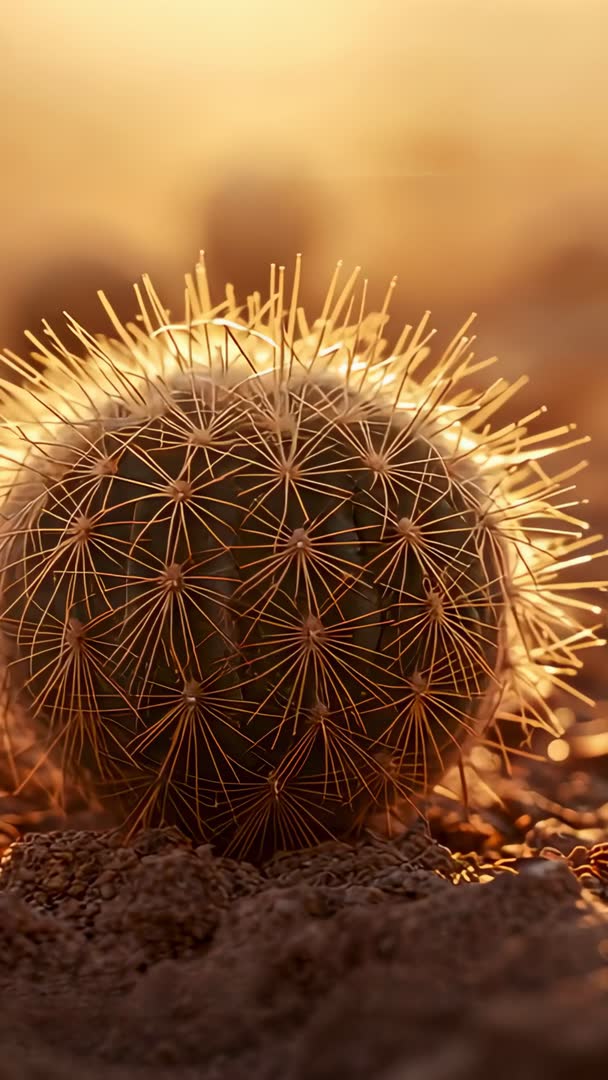 AI Generated Image. Video showing vertical cinematic close-up of barrel cactus, camera pulling focus toward plant while golden sunlight haloing spines and producing warm rim light. Shot featuring shallow depth of field, tight bokeh, globose succulent body, intricate radial spines, and textured rocky ground. Composition working well for vertical reels, social media stories, nature and travel promos, botanical tutorials, and outdoor product advertising. Usage suggestions: use slow-motion for dramatic reveal, apply subtle color grading to enhance warm tones, add title or logo overlays near top or bottom to preserve subject, loop clip for ambient background or mobile wallpaper, combine with ambient desert audio for cinematic sequences. Visual themes highlighting resilience, solitude, natural pattern, and desert beauty. Licensing note: suitable for commercial and editorial use.