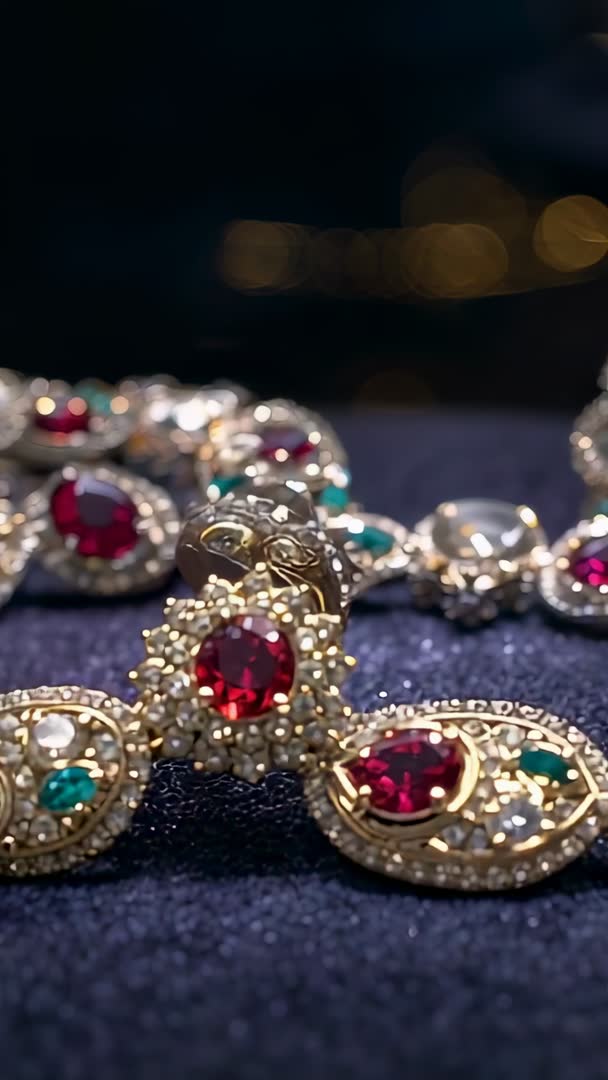 - Vertical cinematic close-up of gold ruby necklace gliding over velvet with bokeh sparkle
