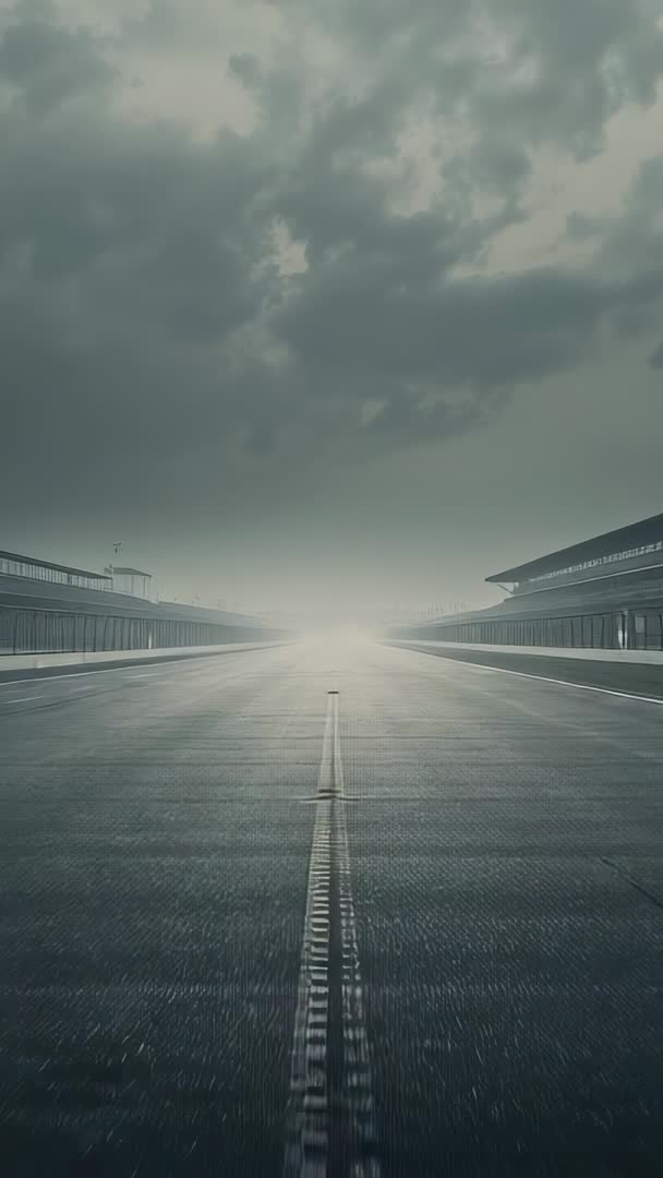 AI Generated Image. Vertical cinematic clip showing camera gliding down center of empty runway with white center stripe leading toward distant horizon. Low light and moody color grading creating dramatic, atmospheric mood. Pit garages flanking both sides, featuring repetitive architectural lines and reflective tarmac textures. Heavy clouds moving overhead, adding tension and cinematic scale. Serving motorsport promos, car commercials, track day trailers, infrastructure presentations, industrial design reels, and weather or storm forecasting segments. Working well as title opener, background for vertical social video, app splash, or countdown leader. Compatible with text overlays, logo reveals, slow motion edits, and color grading experiments. Highlighting vertical format optimized for smartphone screens and social platforms. Preferring slow, steady pacing with slight parallax and subtle lens flare for cinematic impact. Capturing mood of anticipation, speed, and industrial calm.