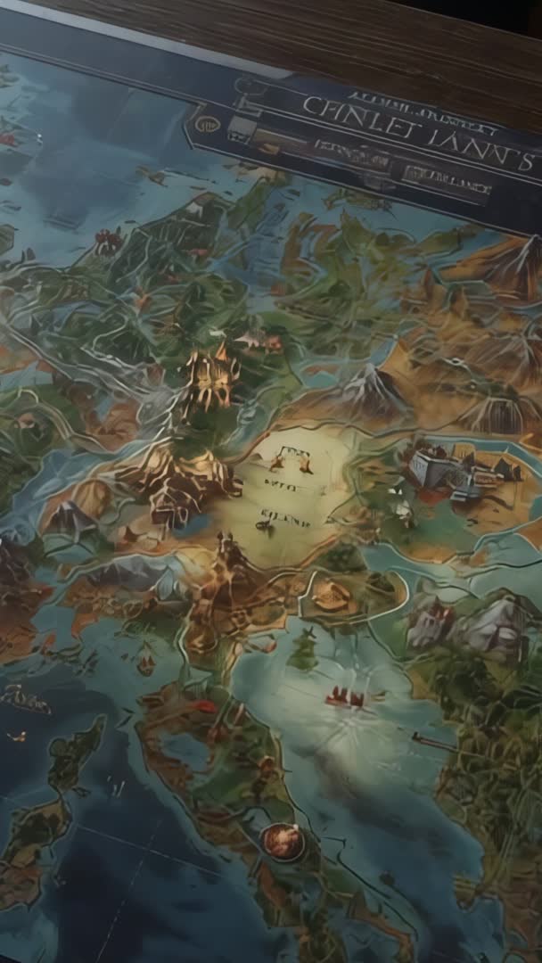 AI Generated Image. Showing vertical cinematic reveal of illustrated fantasy map with camera panning over jagged peaks, fortified castle, winding rivers and coastal bays. Camera moving slowly downward while light catching engraved ridgelines and miniature settlements, creating sense of discovery and scale. Offering strong opening visual for fantasy lore videos, tabletop campaign trailers, RPG livestream intros, board game promos and travel montage stylings. Allowing editors adding title plates, animating map markers, overlaying route lines and recording voiceover narration for campaign briefings and worldbuilding sequences. Delivering moody, adventurous tone suitable for marketing, social reels, streaming overlays and cinematic menus.