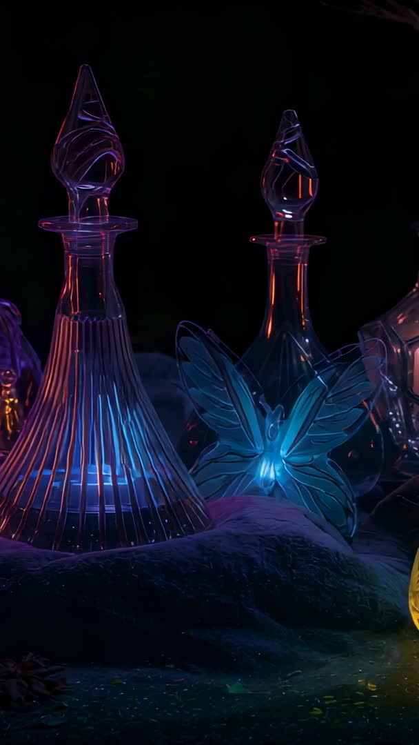 AI Generated Image. Vertical video focusing on slow cinematic pan across crystal decanters while third amber decanter entering frame and casting warm flame glow reflecting across faceted glass surfaces. Blue accent lighting contrasting warm amber highlights, creating moody, luxurious atmosphere. Perfect for advertising high-end barware, spirits, interior design, hospitality, luxury packaging, product launches, social media reels, hero banners. Serving for background footage in promotional videos, title sequences, mood reels, website hero sections. Loop-friendly clip supporting slow motion, speed ramps, seamless looping. Recommending color grading toward teal and orange palette and adding subtle ambient soundtrack or soft piano to enhance elegance. Suited for product showcase, branding, editorial features, online shops, motion graphics projects.