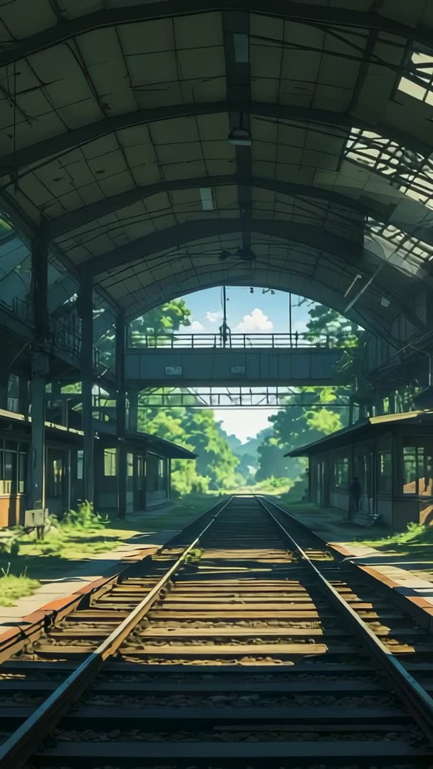 AI Generated Image. Vertical footage showing lone figure pausing on pedestrian bridge, gazing down sunlit railway tracks leading into dense forest. Vaulted canopy and platform architecture framing composition, light filtering through broken roof panels and casting long shadows across rails. Scene conveying solitude, quiet reflection, meditative atmosphere and cinematic nostalgia. Serving well for vertical ads, music video interludes, short film openers, travel vlog transitions, mindfulness or meditation content, urban exploration editorials, book covers for introspective fiction, social media stories and mobile wallpapers. Creative suggestions: applying warm golden grading for nostalgic mood or cool teal-green for moody contrast; pairing with ambient soundtrack or minimal piano for emotional impact; using slow push-in or parallax zoom for dramatic reveal.