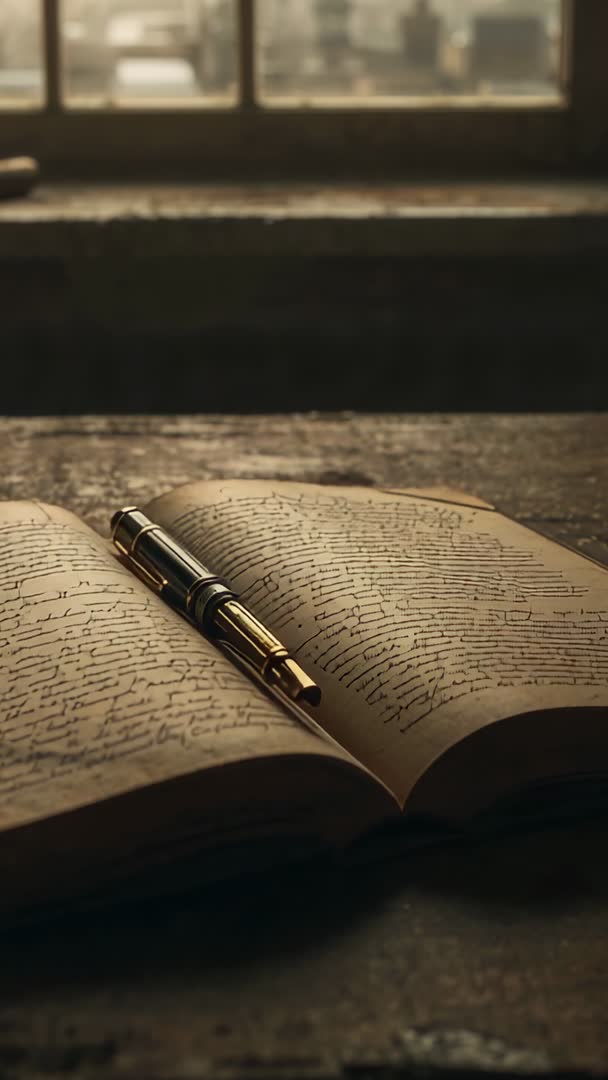 AI Generated Image. Shifting vertical camera revealing vintage journal filled with flowing handwriting and gold-accent fountain pen lying on worn wooden desk beside window while passing car moves outside. Warm daylight streaming through pane, creating soft highlights and deep shadows, with shallow depth of field keeping foreground textured paper and pen in focus while background gently blurs. Serving as cinematic b-roll for stationery and pen commercials, book trailer intros, journaling and writing tutorials, nostalgic lifestyle reels, editorial video about memory and creativity, and antique shop promos. Pairing well with soft ambient music and distant street sound for immersive atmosphere. Offering tight composition, rich warm tones, and slow reveal motion ideal for vertical social media ads, Instagram and TikTok stories, website hero videos, or looping background for storytelling and product showcase.