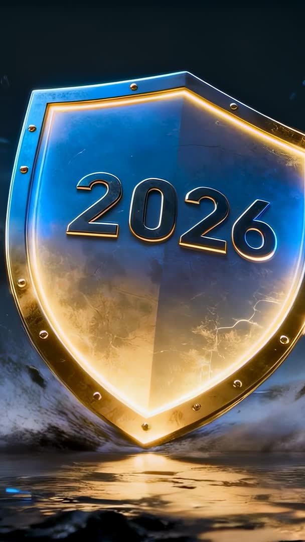 AI Generated Video. Vertical cinematic clip showing rotating metal shield hovering above reflective pool while raised 2026 emblem catches glowing gold trim. Featuring scratched steel texture, subtle sparks, moody blue and amber lighting, and cinematic camera pullback revealing full crest. Working well for New Year 2026 countdowns, event openers, game or trailer intros, security and insurance branding, tech product launches, and social media vertical ads. Editing suggestions include adding title text overlay, cinematic music, metallic clank and water ripple sound effects, and color grade to emphasize blue and gold contrast. Delivering high impact for mobile-first platforms like TikTok, Instagram Reels, YouTube Shorts; also usable in widescreen cuts by cropping or extending background. Provide file variations such as loopable short clip, extended slow reveal, and 4K export for broadcast or promotional campaigns.