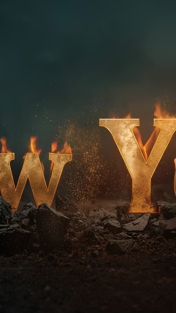 - Vertical cinematic reveal showing flaming gold letters W Y pulsing on cracked ash ground