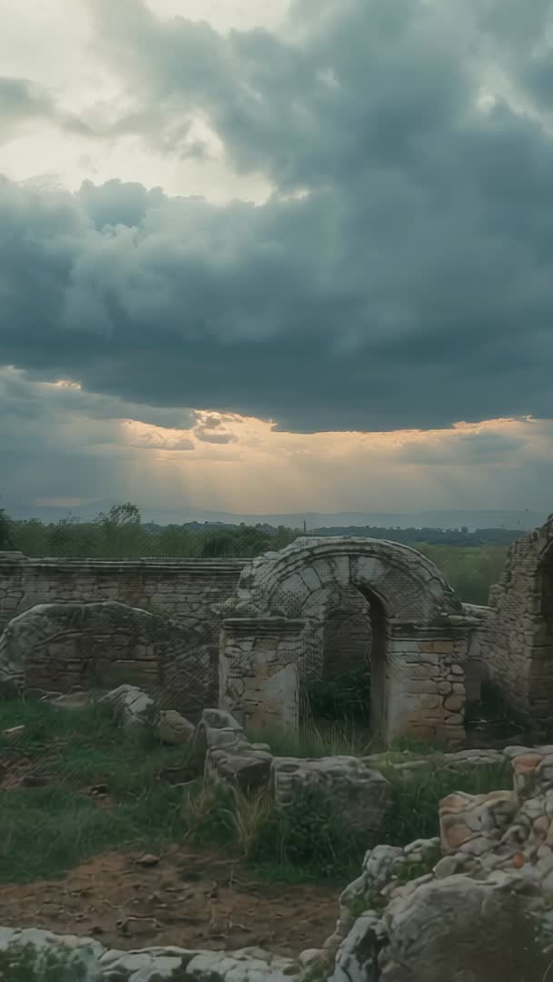 AI Generated Video. Capturing storm clouds parting while low sun casting warm beams across weathered stone arch and surrounding ruins in open countryside. Vertical 9:16 composition providing cinematic framing, dramatic cloud motion and strong foreground texture from worn masonry. Evoking mood of antiquity, solitude and quiet resilience while conveying transition from storm to calm. Ideal for opening sequences in documentaries about history or archaeology, establishing shots for travel and heritage reels, Instagram reels and stories, meditation or ambient video loops, and background for title overlays or promotional campaigns for cultural tourism. Works well with slow motion, subtle color grade emphasizing muted greens and warm highlights, and text lockup for mobile-first distribution.