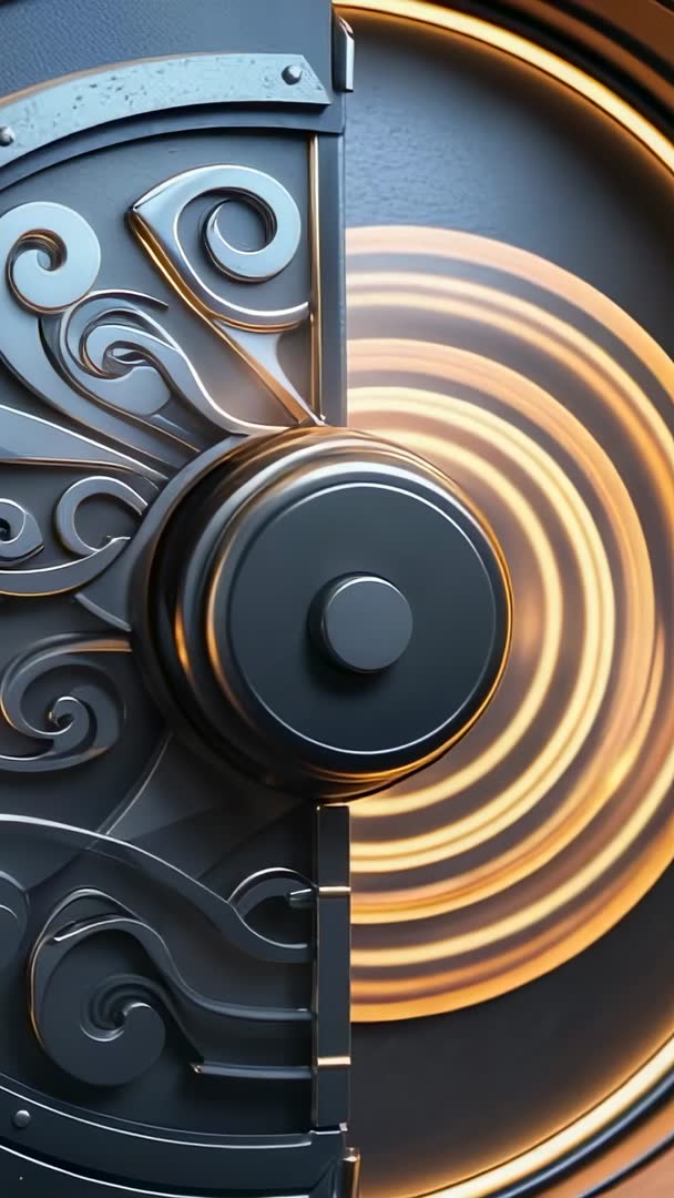 AI Generated Video. Showing close-up of spinning locking hub opening vault door and revealing concentric golden rings glowing inside chamber. Emphasizing contrast between matte steel ornamentation and warm metallic rings for dramatic visual impact. Ideal for security branding, finance and banking promos, luxury product reveals, tech innovation presentations, and sci-fi title sequences. Using vertical format for mobile-first platforms such as Instagram Reels, TikTok, Snapchat, and YouTube Shorts. Offering loop-friendly motion for hero backgrounds, app intros, product ads, and conference visuals. Pairing well with ambient metallic soundtrack, deep bass hits, slow-motion reveals, or quick rhythmic cuts. Allowing space for overlaying text or logo on golden rings area or along left ornamented panel. Supplying cinematic feel for commercial, editorial, and promotional projects needing high-end futuristic security or treasure concept.