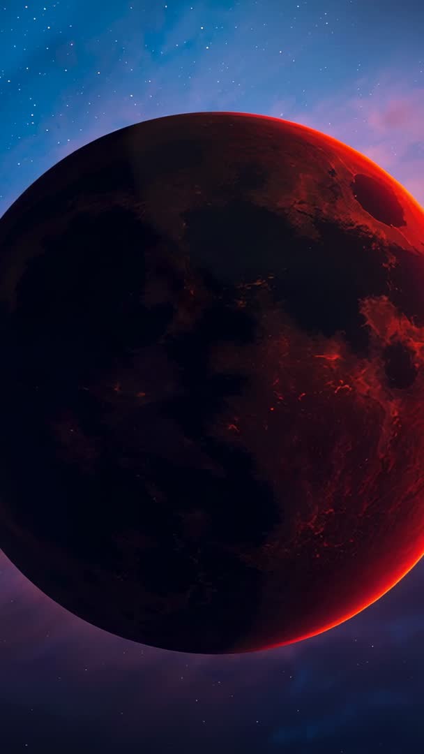 - Vertical cinematic video zooming into dark crimson planet with glowing rim and starfield