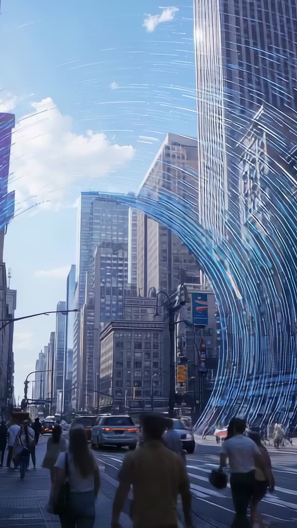 AI Generated Video. Vertical video capturing downtown corridor with glowing blue light ribbon flowing down skyscraper facade while pedestrians cross busy intersection and cars slow. Composition offering strong vertical movement and ample copy space at top for title or logo. Working well for technology promos, smart city and energy brand campaigns, sci-fi trailers, urban mobility and transit stories, social media vertical ads and VFX reels. Working well as hero clip for website headers, Instagram Reels, TikTok ads or news opening for urban innovation stories. Edit suggestions: applying cool cinematic color grade, enhancing light streaks, adding motion blur and particle glow, tracking text along ribbon path, adding low-frequency sound design for impact and speed ramping for dramatic reveal. Delivering futuristic mood while remaining grounded in realistic city details. Vertical orientation 9:16, high-resolution, silent-playback friendly for captions and overlays.