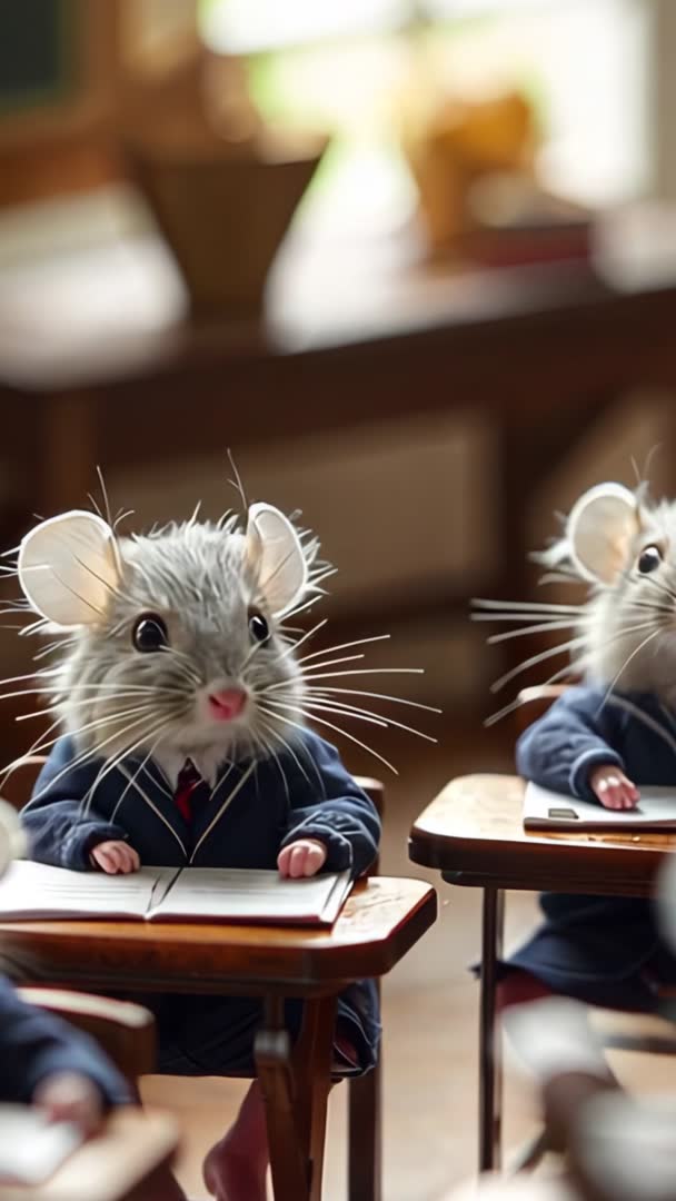 AI Generated Video. Featuring grey mouse students in navy uniforms, nodding attentively and gazing at open notebooks while sitting at wooden desks in vertical video format. Close-up framing focusing on expressive whiskers, round ears, and tiny hands resting on pages, creating charming family-friendly classroom atmosphere. Perfect for children's education projects, animated book trailers, school campaign videos, social media vertical reels, storybook introductions, and edtech app demos. Suggesting gentle piano or classroom ambient sound, warm color grade, and slow push-in to emphasize focus and concentration. Allowing room for text overlays, logo animations, and voiceover narration for lesson intros, promotional spots, or app onboarding sequences.