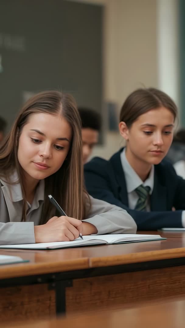 AI Generated Video. Vertical classroom video panning across teenage students sitting at desks and writing notes in notebooks under natural daylight. Featuring shallow depth of field focusing on foreground student with soft defocused classmates and chalkboard background. Capturing candid concentration, uniform details, and authentic classroom atmosphere. Ideal for education websites, school promotional videos, back-to-school campaigns, e-learning course intros, teacher training materials, classroom management presentations, study tips or exam preparation videos, education apps, and social media vertical ads. Works well with voiceover, text overlay, or upbeat background music. Crop-safe for mobile stories and reels, suitable for full-screen portrait formats. Color grading warm to enhance daylight and skin tones. Licensing friendly for commercial and editorial projects.