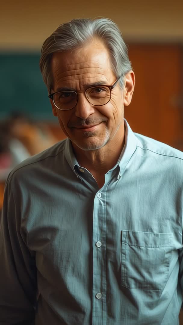 AI Generated Image. Vertical close-up video featuring smiling mature teacher wearing glasses and light blue button-down shirt, standing front of classroom with blurred chalkboard background. Making warm eye contact and responding to student gaze with slight smile and gentle nod, conveying approachability and quiet confidence. Soft warm lighting and shallow depth of field creating intimate, professional mood. Useful for educational promos, online course intros, teacher profile videos, university recruitment, social vertical ads, corporate training clips, webinar thumbnails, and content creator B-roll. Editing tips: leave room at bottom for lower-third text or logo, maintain 9:16 aspect ratio, trim into 5-20 second loopable segments for social use, apply warm color grade to enhance friendly tone. Suggested on-screen text ideas: educator introducing lesson, teacher connecting with students, mentor offering guidance, professor leading lecture.