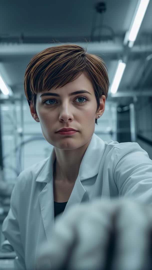AI Generated Image. Vertical clip showing focused lab technician with short hair wearing white lab coat and gloves, leaning toward bench and reaching toward equipment in sterile cleanroom environment. Camera framing prioritizing close-up on face and gloved hand, conveying concentration, precision, careful sample handling and steady technique. Lighting creating clinical cool tone with visible overhead lab fixtures and organized bench background. Use ideas: training videos demonstrating lab technique and aseptic handling, clinical research and biotech marketing, equipment demos and product showcases, lab safety and compliance materials, social media vertical ads and reels, corporate presentations and investor pitches for biotech and medical companies, e-learning modules on laboratory procedure and competency. Pairing with text overlays for highlighting technique, safety steps, equipment features, or adding voiceover tutorial. Suitable for editorial use in healthcare articles, scientific storytelling, recruitment materials, and profiles on laboratory careers or scientist work.