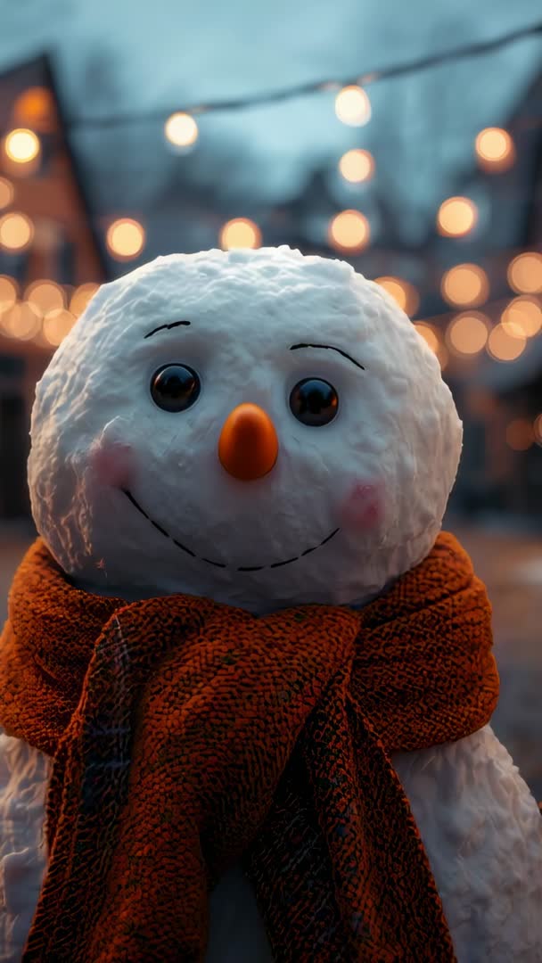 AI Generated Image. Showing vertical clip of close-up snowman figurine with glossy eyes, carrot nose, rosy cheeks and textured knit scarf while warm market lights create soft bokeh at dusk. Capturing cozy festive mood ideal for holiday campaigns, seasonal event promos, social media reels, and greeting card animations. Suggesting use as opener for Christmas market highlights, looped background for Instagram Reels or TikTok, banner for seasonal storefronts, or animated visual for email greetings. Providing vertical 9:16 aspect ratio optimized for mobile platforms and leaving blurred upper background area for lower-third text or logo placement. Pairing warm orange scarf tones with cool blue twilight for elegant holiday color palettes and headline overlays.