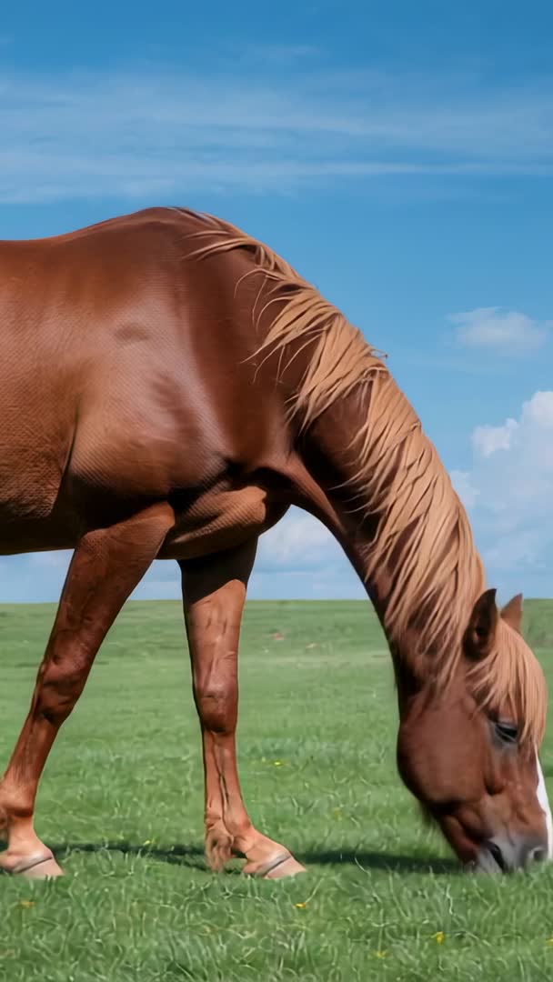 - Vertical clip: Chestnut Horse Grazing in Sunny Meadow with Flowing Mane and Blue Sky