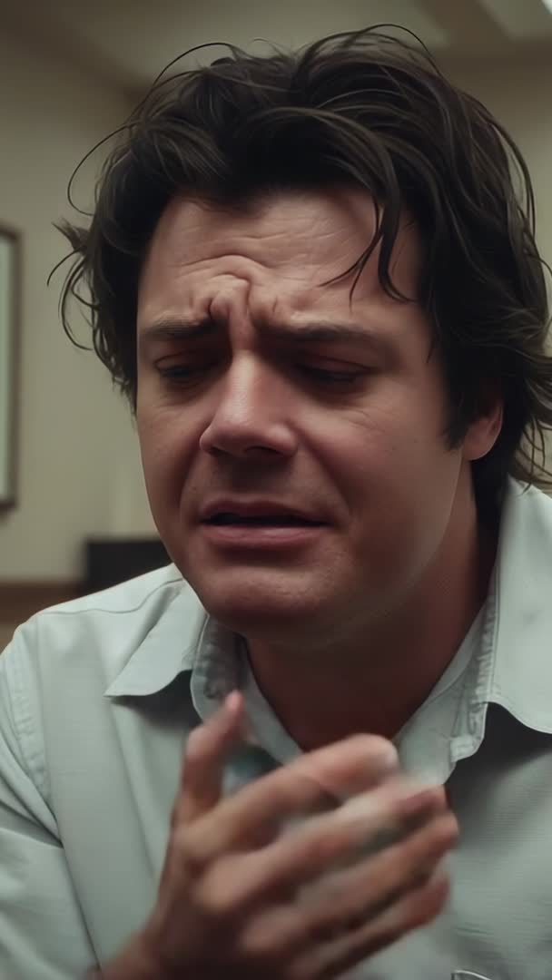 AI Generated Video. Vertical closeup clip showing man in collared shirt reacting to shocking news in office environment. Face conveying tension with furrowed brow, closed eyes, tight mouth and hand moving toward mouth while neck muscles tighten. Mood is anxious and distressed, suitable for conveying stress, bad news, regret, or crisis moments. Use for mental health awareness content, workplace training modules, news b-roll, dramatic film sequences, social media reels and vertical ad spots. Clip works well as emotional cutaway, transition shot, or background visual to support articles and presentations about stress, burnout, decision making or urgent workplace issues.