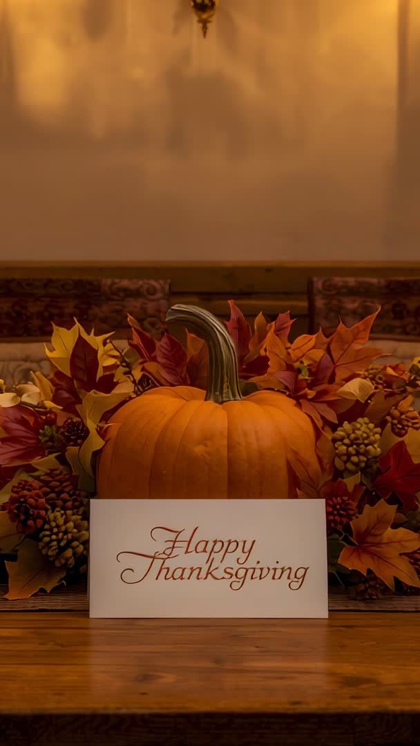 AI Generated Video. Vertical clip showing pumpkin centerpiece with Happy Thanksgiving card on wooden table surrounded by autumn leaves and berries. Warm amber lighting creating cozy fall mood. Camera holding steady close-up then slowly pulling back to reveal fuller table composition and decorative accents. Serving as opening title or interstitial for seasonal recipe videos, social media stories, Instagram Reels, and holiday e-card campaigns. Working well for retail promotions for home decor, florists, farmers markets, and grocery stores. Providing ideal background for text overlays, lower third graphics, or voiceover narration celebrating Thanksgiving, harvest, and family gathering. Color grading emphasizing warm orange and brown tones to match autumn palettes and brand visuals.