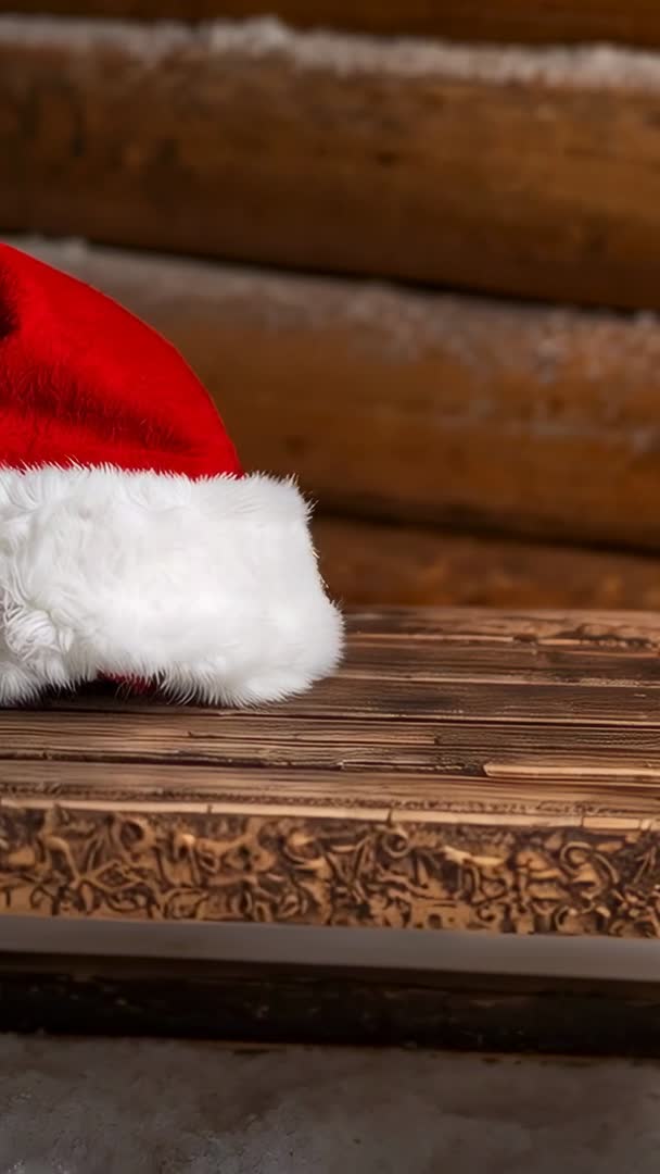 AI Generated Video. Revealing frosted red Santa hat resting on carved wooden bench with visible snow dusting on wood grain. Shifting camera movement moving vertically to reveal fur trim and rustic log wall background, emphasizing texture and warm tones. Vertical framing optimized for mobile, social reels, and story formats, allowing easy text or logo overlay on clear space. Featuring seasonal, cozy atmosphere suitable for holiday marketing, Christmas greetings, lodge or cabin vacation promotions, rustic product backgrounds, and festive blog or website headers. Pairing with warm music and simple animated text for promotional spots, countdowns, or gift guide videos. Providing high contrast between red hat and wooden backdrop for strong visual impact and easy color grading.