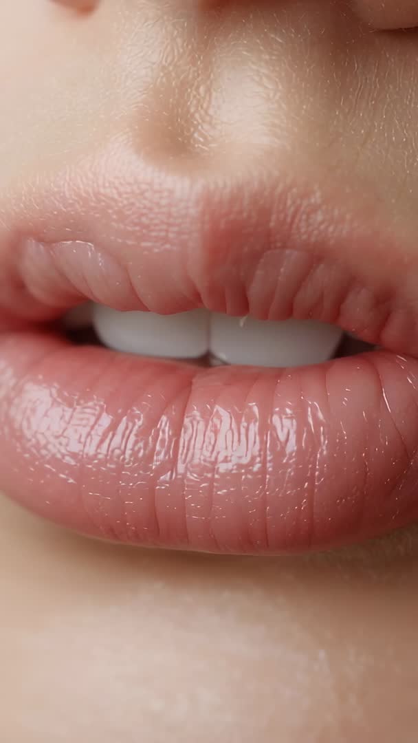 AI Generated Video. Vertical macro video showing glossy lips parting and revealing front teeth while subtle saliva strand forms. Close-up focus highlighting lip texture, gloss reflection, skin pores and small mole near upper lip. Studio lighting creating soft highlights and natural skin tones. Ideal for cosmetics ads, lip gloss product demos, beauty tutorials, social media reels, makeup packaging, dental care promotions and editorial features on sensual aesthetics and skincare. Editing suggestions include slow-motion loop for short-form content, tight crop for thumbnail, color grading to enhance warm or cool tones and adding voiceover or text overlay for product callouts. Suitable for high-resolution vertical formats including mobile ads and stories.