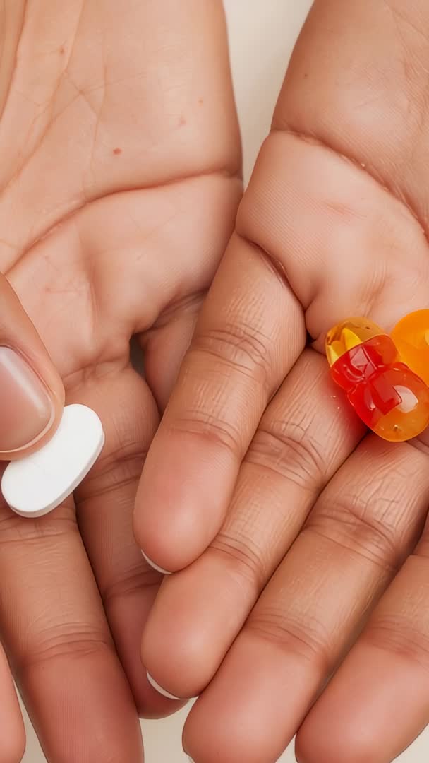 AI Generated Image. Showing vertical close-up of hands placing heart-shaped tablet into left palm while holding orange gummy vitamins in other hand. Featuring cupped palms, visible skin texture, tight crop, and warm studio lighting for clean, inviting look. Working well for social media vertical ads, mobile app onboarding, supplement product pages, pharmacy web banners, wellness blog tutorials, and educational dosage guides. Allowing easy cropping for smartphone screens and adding text overlays or call-to-action graphics. Shooting notes: tight focus on fingers and tablet, shallow depth of field, neutral background, warm color palette.