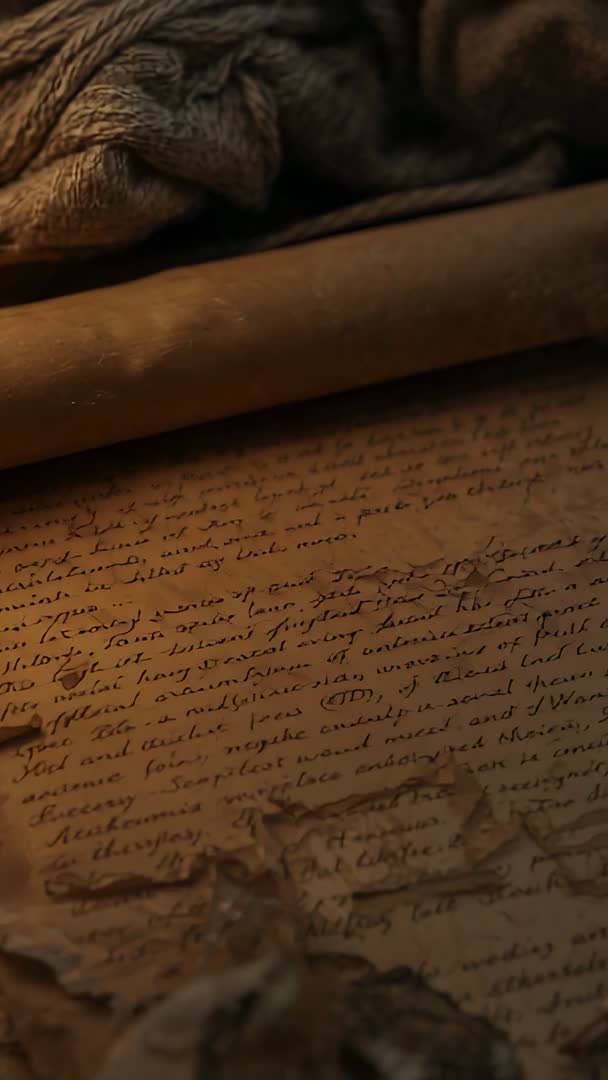 AI Generated Video. Vertical camera movement showing close-up of aged parchment manuscript with flowing cursive ink handwriting, rolled scroll and cloth seal resting on wooden desk under warm amber light. Paper texture, ink blots, faded edges and creases creating antique atmosphere. Footage matching history documentaries, period dramas, museum exhibits, book trailers, editorial stories about preservation, or social media reels. Recommending color grading for enhancing warm tones; pairing with soft ambient music or paper rustle for immersive sound; using slow push-in or subtle rack focus for cinematic reveal. Vertical 9:16 composition leaving negative space for titles, lower thirds, or captions; loopable portion supporting background visuals for websites, presentations, or promotional reels.