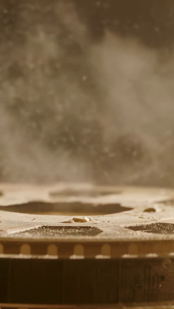 Vertical close-up of boiling pan releasing steam and golden droplets over gas burner Video