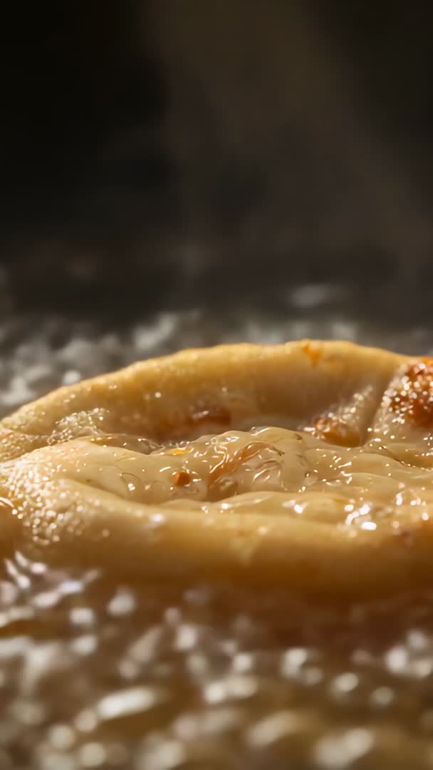 AI Generated Video. Vertical 9:16 close-up video capturing dough fritter ring frying in shimmering hot oil, forming golden brown bubbles and rising steam. Tight macro framing highlighting surface texture, oil reflections and sizzling motion, with shallow depth of field and warm golden tones. Ideal for social media reels, recipe tutorial intros, restaurant promo clips, food ads, menu backdrops and looped cinemagraphs. Perfect for fast-paced edits, slow-motion reveals, close-up transitions or background footage behind text overlays and logos. Trim to 15-30 seconds for vertical platforms, color grade for richer golds, add ambient sizzle sound to enhance mouthwatering appeal. Leave ample negative space at top for headline or logo placement. Suitable for culinary brands, street food stories, bakery marketing and recipe countdowns.