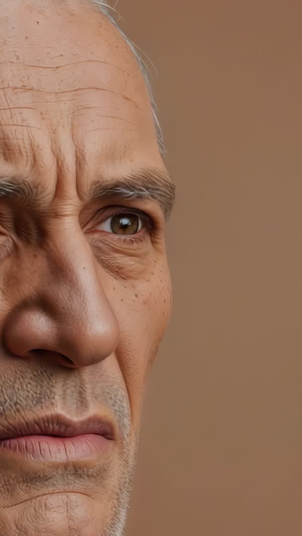 AI Generated Image. Vertical close-up showing older man contemplating, with pronounced wrinkles, stubble and focused gaze on warm beige backdrop. Frame emphasizing microexpressions and skin texture for authentic emotional storytelling. Use for mental health campaigns, elder care advertising, documentary sequences, corporate branding, cinematic openers, or social media vertical ads. Recommend slow cross-dissolve edits, tight 9:16 framing, neutral color grading, and 24–30 fps pacing to preserve subtle motion. Allow space on right side for lower-third text or logo without obscuring face. Ideal for tile banners, app backgrounds, website hero sections, TV spots, or nonprofit awareness materials requiring dignified mature subject representation.