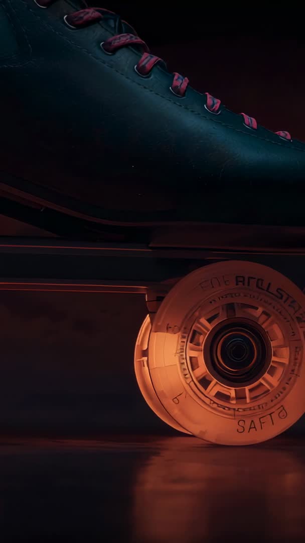 AI Generated Video. Panning vertical footage capturing close-up of retro quad roller skate, focusing on amber-lit wheel, detailed hub text, and pink laces. Low-angle composition creating cinematic mood with glossy floor reflections and warm color grade. Tight framing emphasizing wheel texture, seam details, bearing, and subtle scuff marks for authentic product feel. Ideal usage for social media reels, TikTok ads, Instagram Stories, ecommerce product promo, lifestyle commercial, music video visuals, and blog hero sections. Creative ideas include looping clip for continuous motion, applying slow-motion ramping to accentuate wheel rotation, overlaying animated branding plate on upper frame, and matching color grade with neon typography for retro campaign. Technical tips recommending delivery as vertical 9:16 clip, export in 4K for cropping flexibility, and providing short 6-12 second cuts optimized for mobile platforms. Suitable for editorial and commercial projects showcasing skate footwear, urban leisure, and retro sports aesthetics.