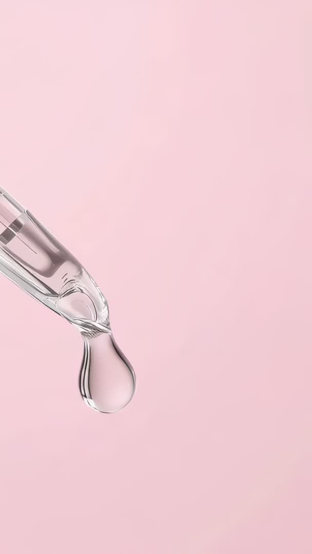 AI Generated Image. Vertical macro video showing glass dropper releasing single clear droplet over soft pink background. Shot focusing on liquid surface tension, droplet pinch-off, and graceful fall, creating elegant minimal composition and ample copy space. Conveying purity, precision, and luxury while maintaining clinical cleanliness and feminine tone. Perfect for beauty and skincare branding, cosmetic product launch, serum ingredient highlight, laboratory presentation, or clinical aesthetics. Use for hero banners, Instagram Reels, TikTok content, website headers, packaging mockups, editorial spreads, or promotional ads. Color palette and negative space supporting overlay text, logos, and product information. Provide slow-motion clip options for close-up detail and scientific demonstration.