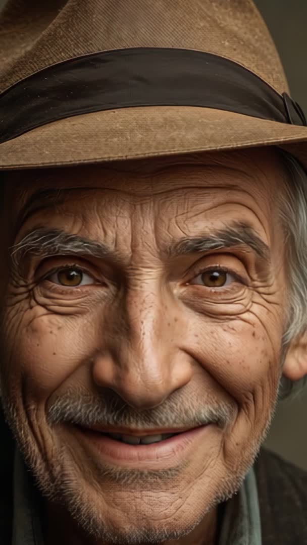 AI Generated Image. Showing vertical close-up of senior man smiling after camera focus, wearing brown fedora and light stubble. Capturing deep facial lines, warm brown eyes, subtle smile, and gentle charisma with soft directional light and shallow depth of field for intimate cinematic look. Highlighting authenticity, age details, and expressive features for character-driven storytelling. Perfect for use in elder care campaigns, retirement community marketing, family heritage projects, travel and storytelling videos, documentary portraits, brand storytelling, testimonial segments, social media reels, and vertical ad formats. Useful as opening shot for character-driven short films or as stock clip for commercial storytelling. Crop-safe for mobile display, recommended warm color grade and ambient acoustic music to enhance emotional mood.