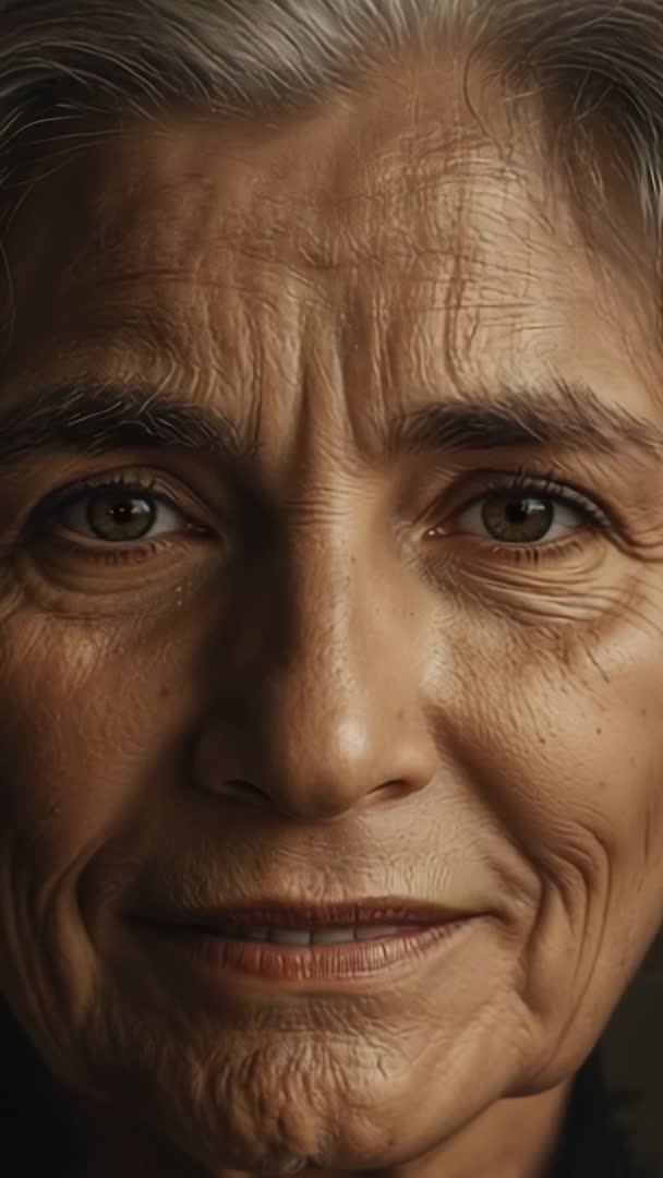 AI Generated Image. Showing vertical pull-focus close-up of senior woman smiling calmly in warm, soft interior light. Capturing fine wrinkles, detailed skin texture, and steady eye contact to convey wisdom, resilience, and serenity. Creating intimate, cinematic mood with slow lens rack and gentle expression. Suitable for healthcare and eldercare marketing, retirement community promotions, wellness and mindfulness content, beauty and skincare for mature skin, documentaries or social campaigns about aging and intergenerational connection. Working well as b-roll, opening sequence, hero clip, or cutaway to emphasize empathy and human connection. Allowing color grading and soft piano score to enhance emotional tone and storytelling.