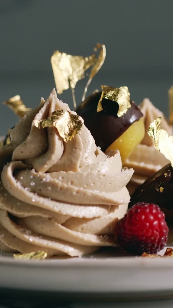 Vertical close-up revealing chocolate mousse with gold leaf, truffle and raspberry Video