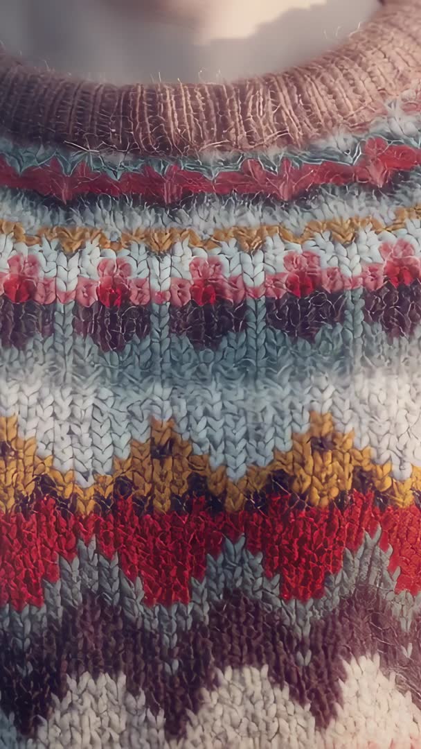 - Vertical close-up revealing Fair Isle sweater texture, colorful knit patterns and cozy video