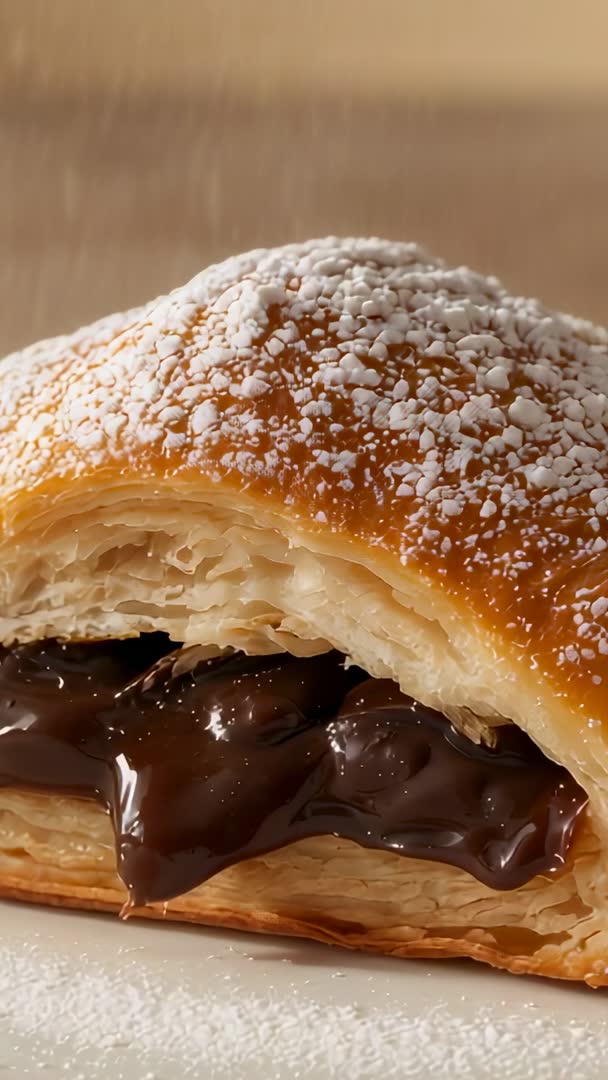 AI Generated Image. Vertical food video capturing close-up of halved croissant with glossy molten chocolate ganache oozing from laminated layers while powdered sugar gently dusting top. Composition highlighting flaky texture, caramelized exterior and rich glossy filling, creating strong mouthwatering appeal. Vertical 9:16 framing making clip ready for social media reels, stories and short-form video platforms. Use for bakery promotion, product pages, recipe tutorials, breakfast or dessert blog headers, cafe menu displays and advertising banners. Suggest adding slow-motion drip, tight edits and text overlays to emphasize indulgence and flavor. Lighting notes: soft warm highlights and shallow depth of field enhancing texture and shine. Color grading suggestions: slightly warm tone with boosted contrast on chocolate and preserved highlights on pastry.